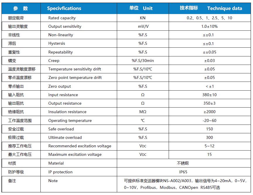 输出:1mv/V、0~±5/10V、4~20mA可选